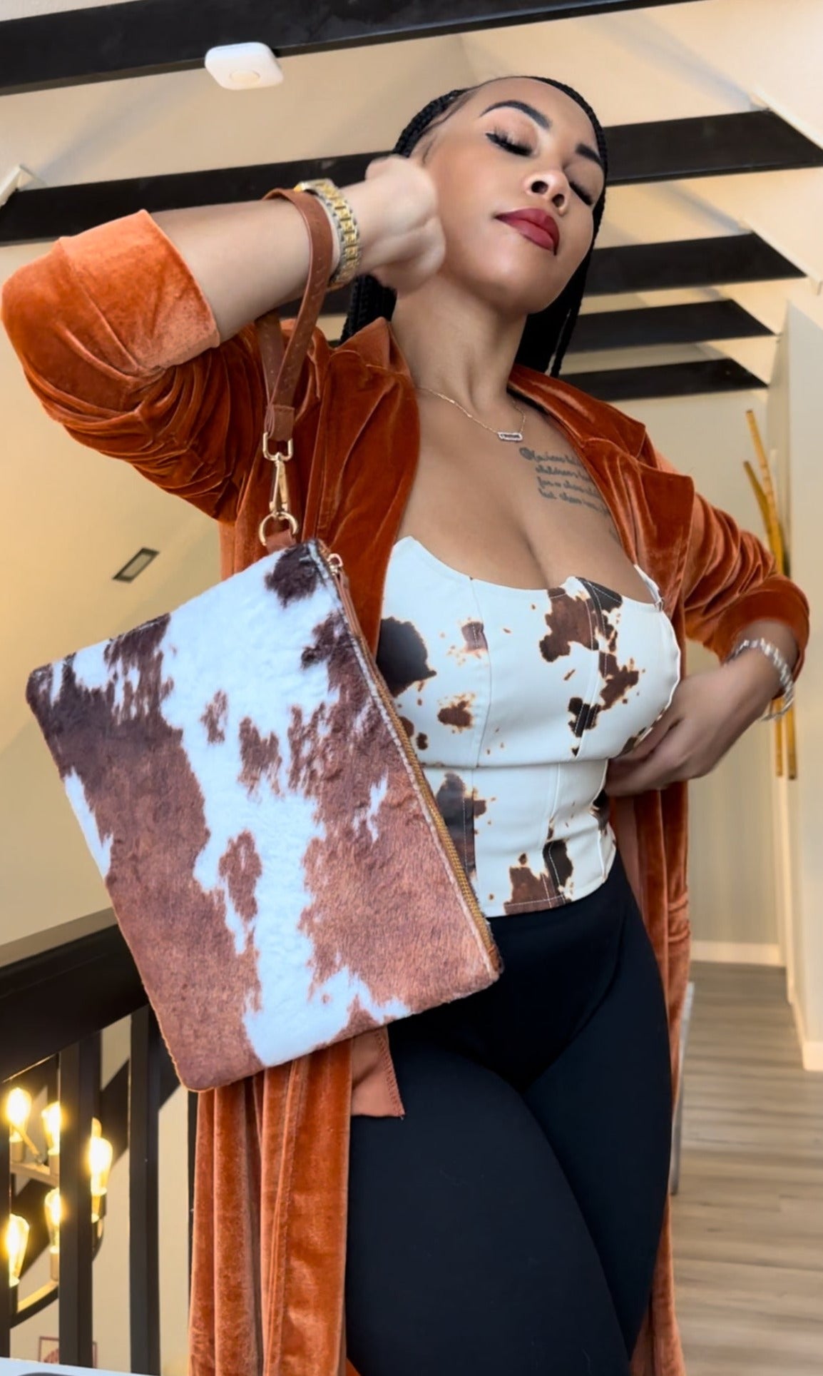 Who doesn't love cow print? The Moo clutch is the perfect size to hold all of your personal belongings comfortably while satisfying your animal print love. Features zip closure, faux fur, cow print design and wristlet. Feeling the velvet duster? Checkout the Rust Velvet Duster.