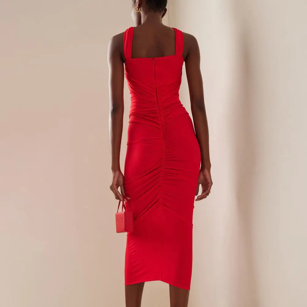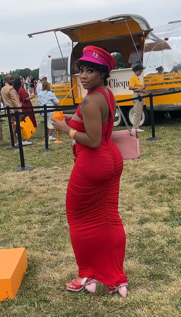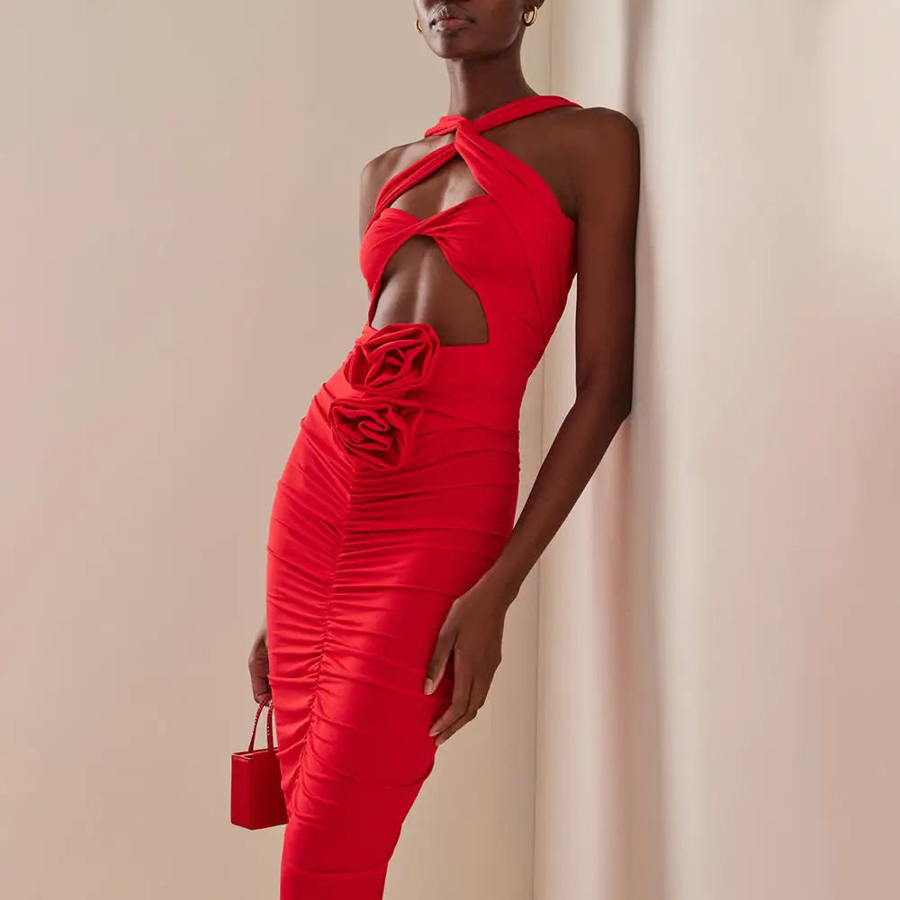 Ladies who's ready to bloom?? This dress is oh soo flattering! Hugs in all the right places. You'll be sure to feel like a rose in this dress! Features a halterneck neckline, an eye-catching cutout, a beautiful floral applique and pleated stitching that accentuates your hips. Main picture model is wearing a size medium.